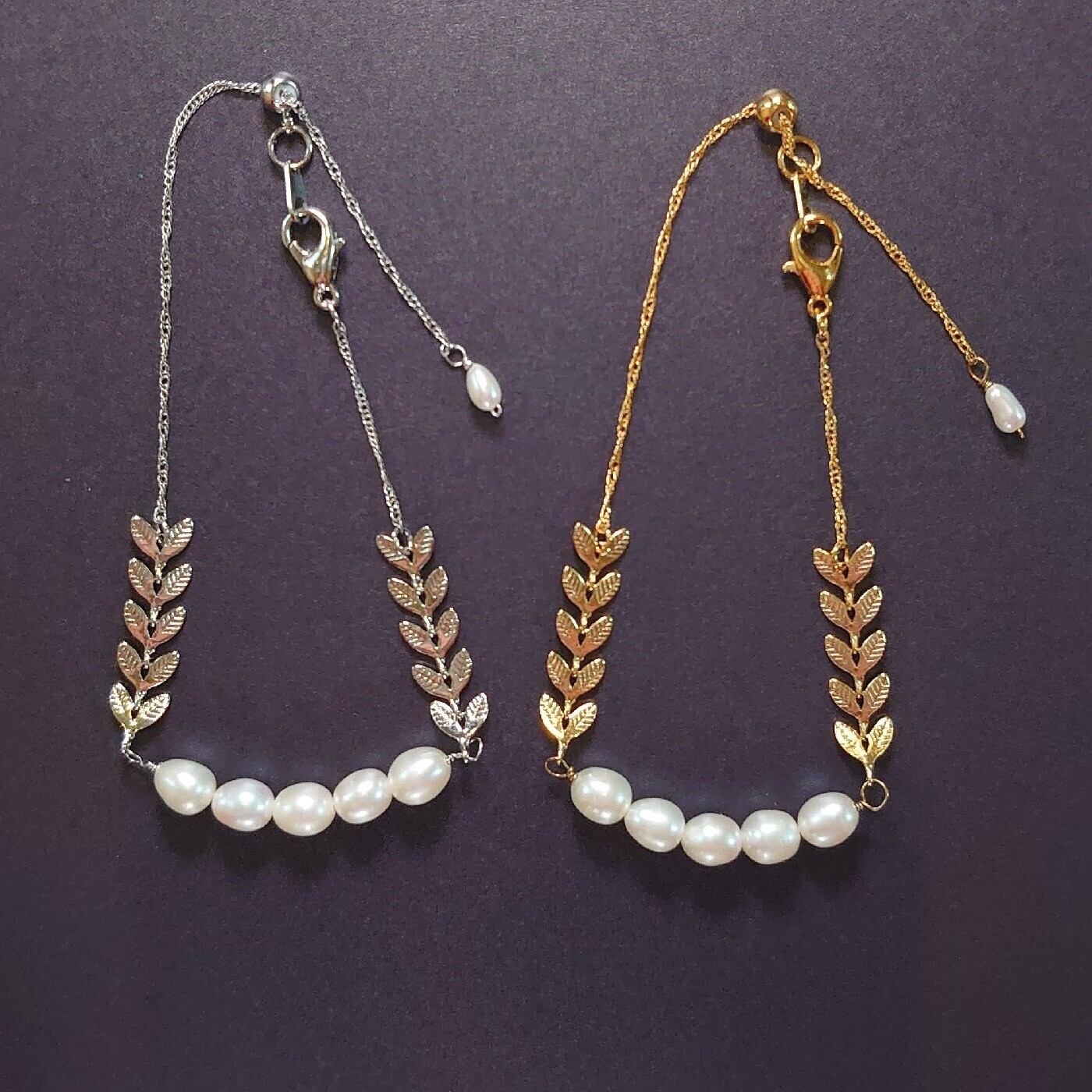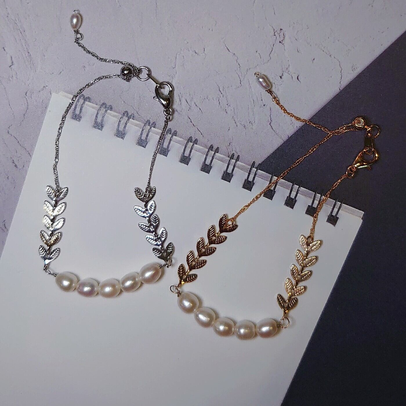 淡水パールとリーフチェーンの接続には、0.3mmのステンレスワイヤー(素地または24kgp)を使用し、メガネ留めで繋げております。