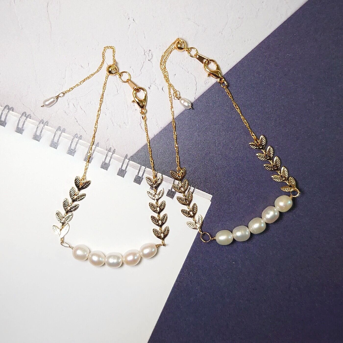 蕾のような俵型の淡水パールに、リーフチェーンを合わせて春の芽吹きをイメージしたネックレス製作いたしました。