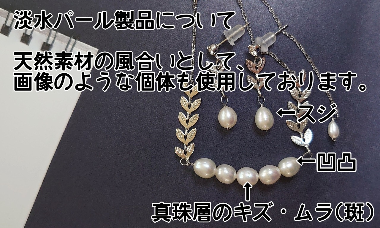 淡水パールは天然素材のため、色味や形、大きさに個体差があり、「キズ」や「スジ」、「真珠層のムラ」などもございます。