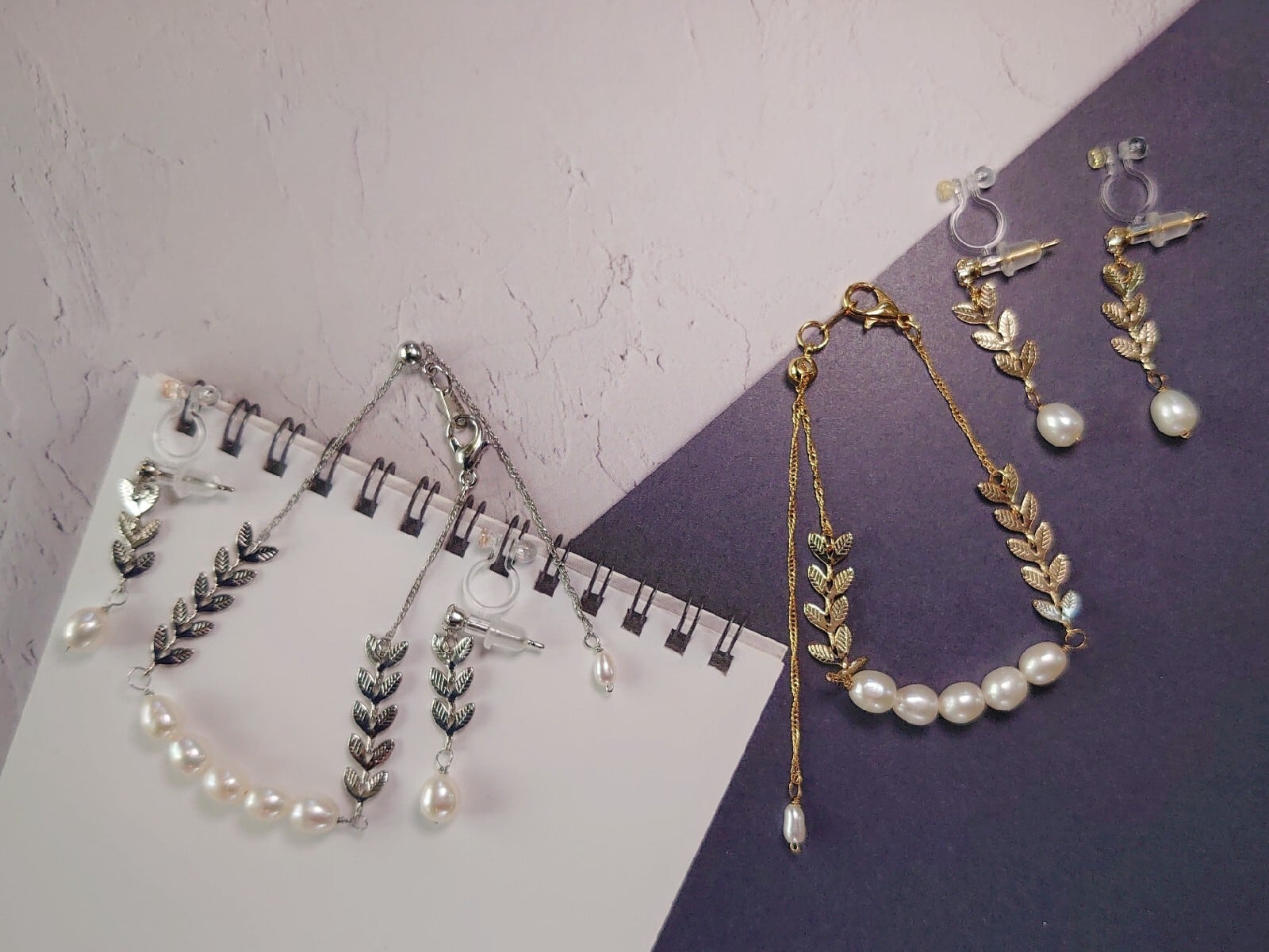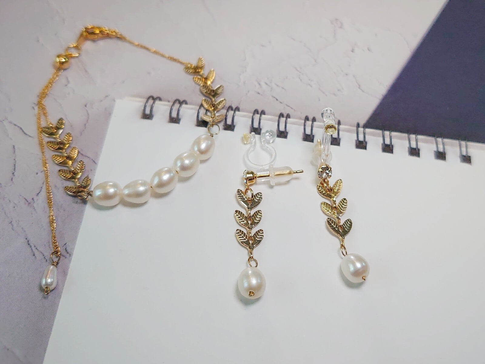 耳飾りはお揃いの若葉をイメージしたリーフチェーンを使用。