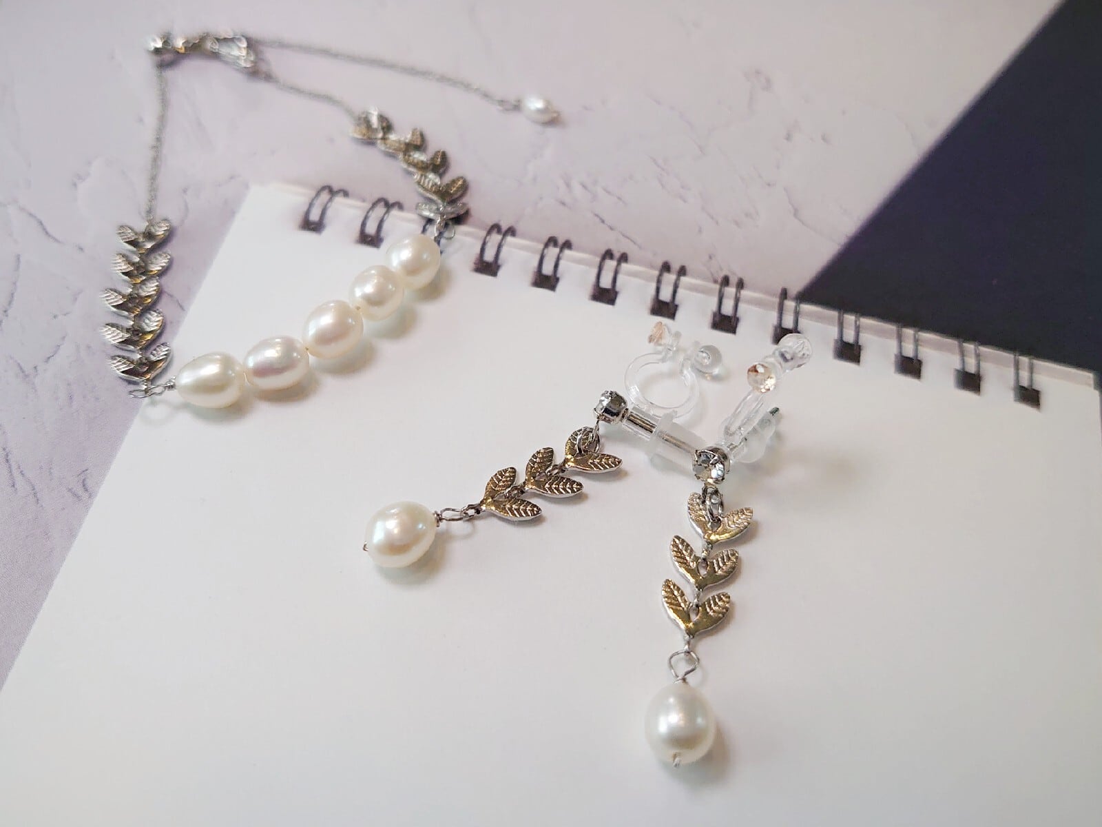 ~淡水パールとリーフチェーンのネックレスと耳飾り~