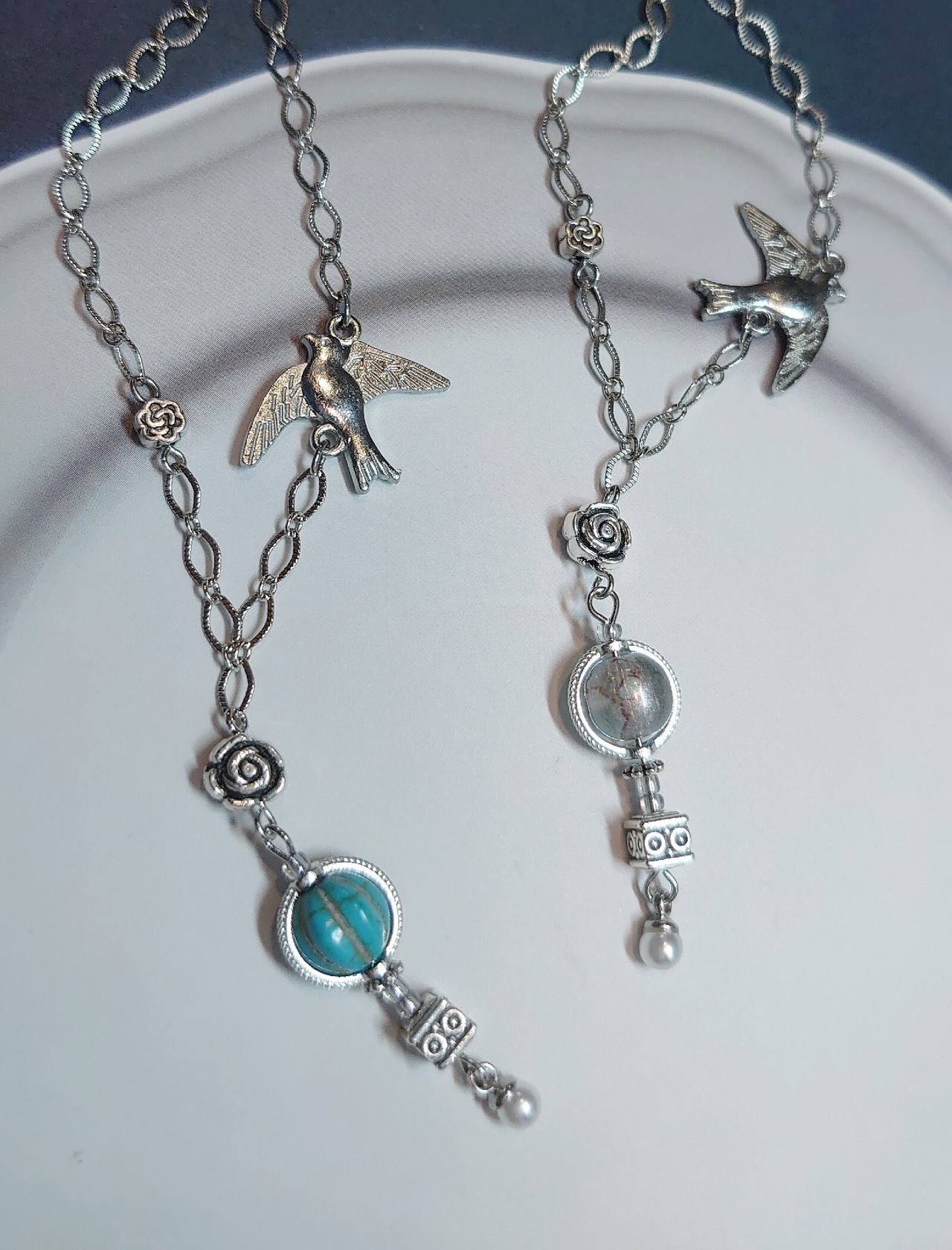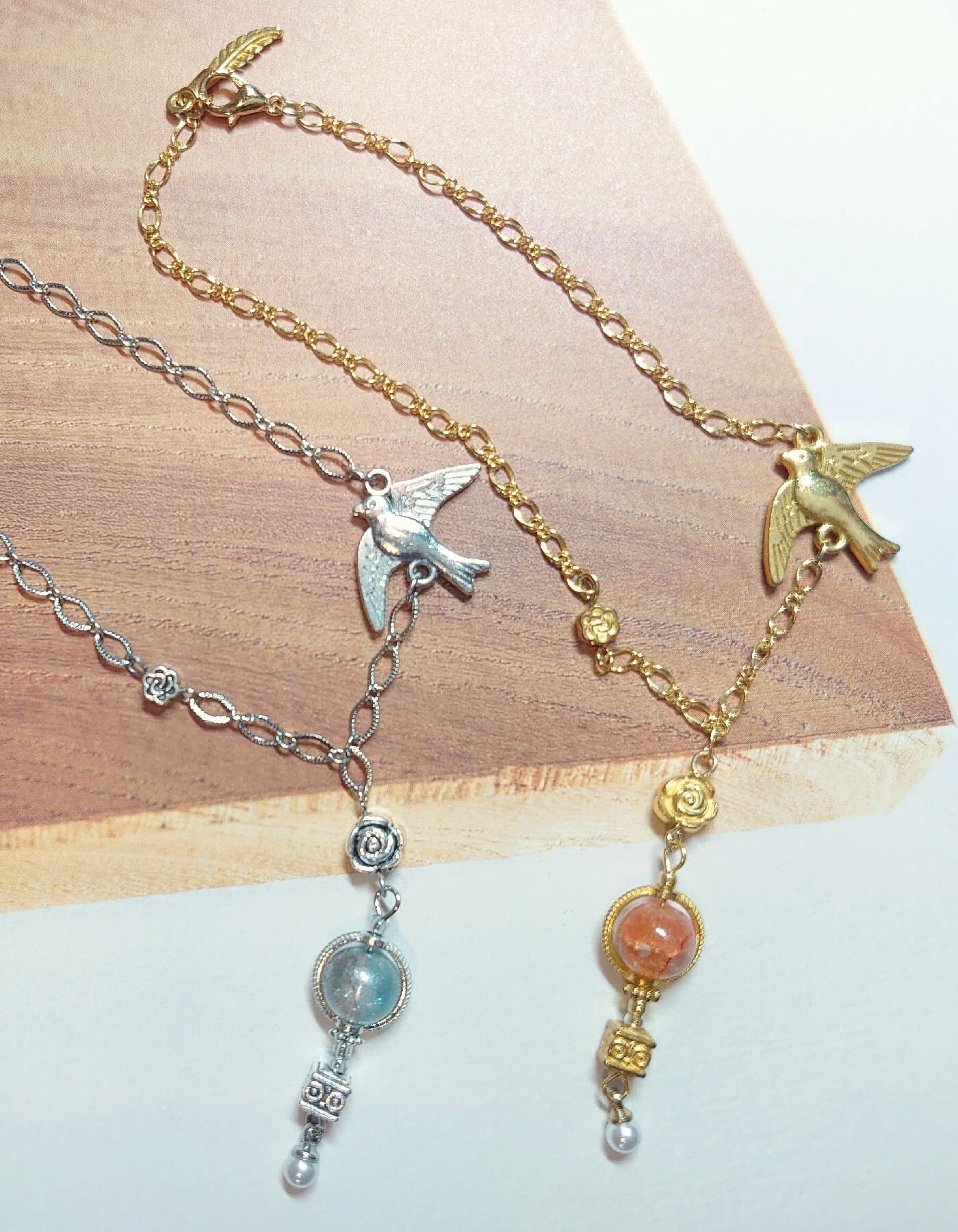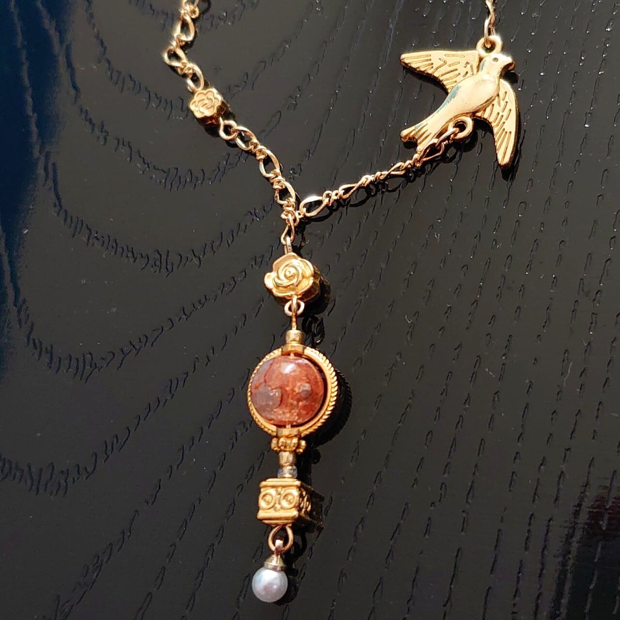ゴールドの鳥とメタルフラワービーズの間に向かって飛行する気球のペンダントです。